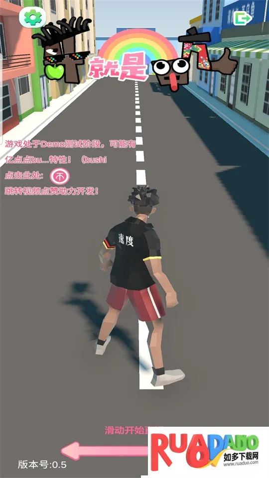 3. 玩法轻松搞笑,在赛道中能控制甲亢哥移动,躲避路人,触发骑乘、收集保镖等效果,通过特殊服装门还能更换造型。