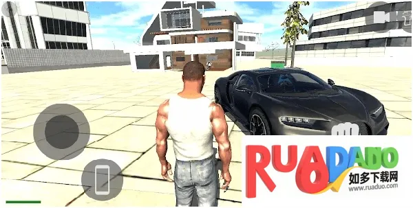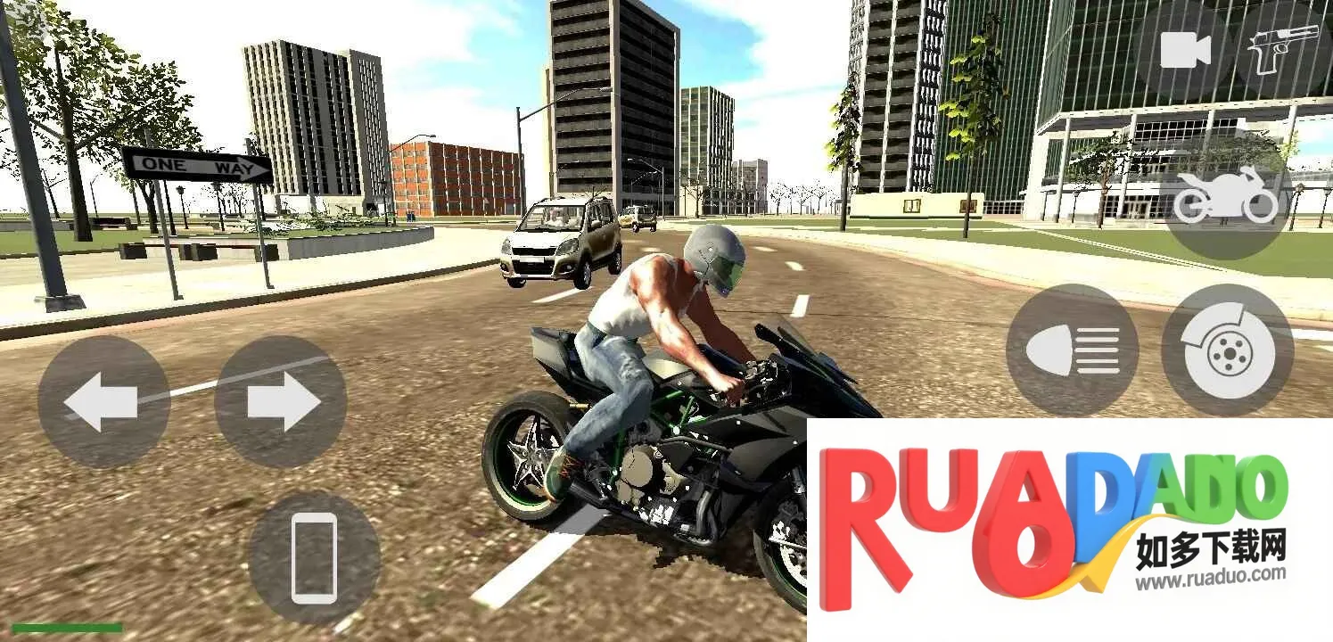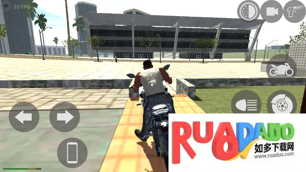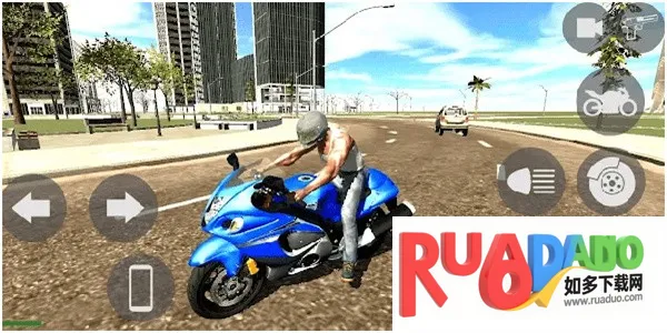 2、通过控制摇杆让人物走到房子外骑上摩托车,点击左右两侧的功能按钮控制车辆。