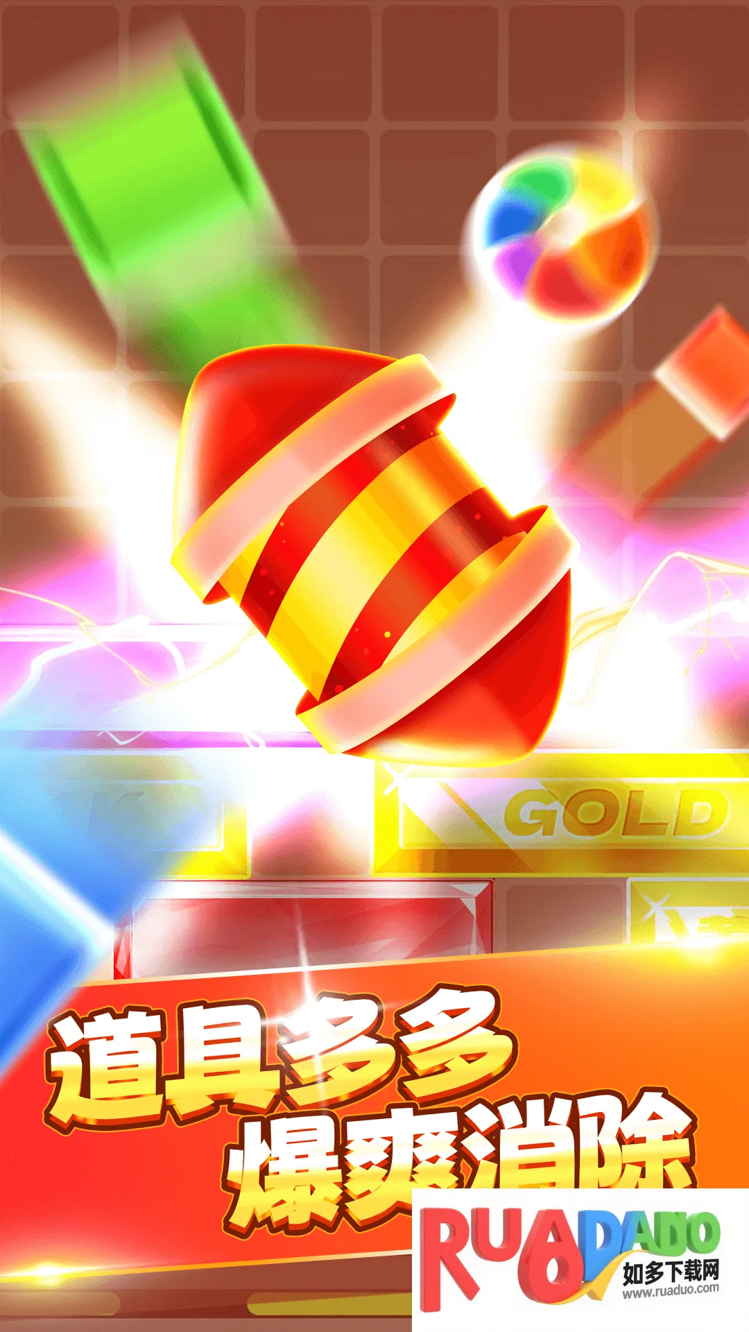 3. 操作易上手,让方块下落填满一横或一竖即可消除,还能利用道具完成挑战拿奖励。