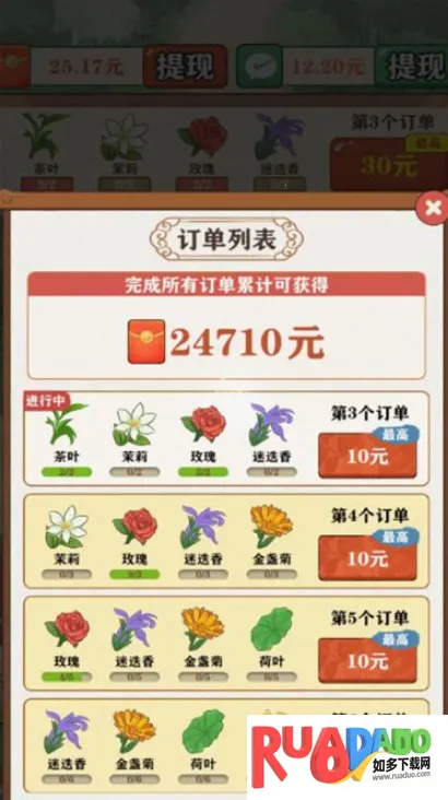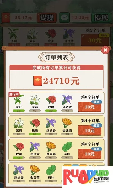 想知道在茶香世家一天能赚多少钱?这款游戏能满足你的需求!它是古风古韵的茶园经营模拟游戏,继承茶园后,你能规划种植各类茶叶,售出后赚取财富。游戏里有欢乐解压的种植活动任务,完成能得丰富奖励,还有红包掉落。特色玩法多,能拥有虚拟茶园,选合适土壤、施肥浇水培育优质茶叶,收获丰厚奖励,还能按喜好打造茶园。亮点也不少,用道具助茶叶快速成长,资金搭配解锁图鉴,购买高级肥料加快生长。有独特红包系统,经营时能收集红包分享给好友。操作简单易上手,轻松愉快的节奏适合碎片时间玩。既能享受种茶品茶乐趣,又能赚钱,社交互动还能增进友谊,一起打造繁荣茶园,快来试试吧!