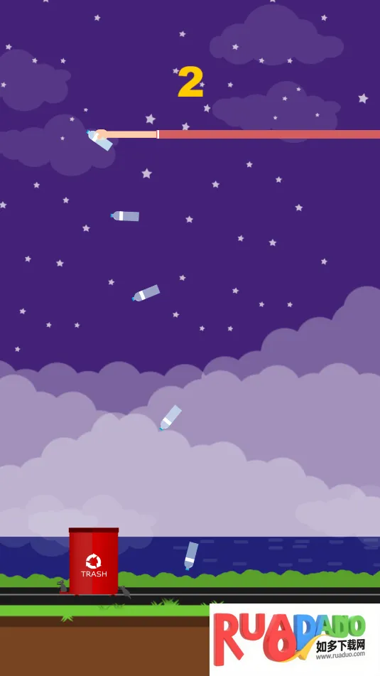 1. 这是一款有趣的模拟休闲游戏,玩家在固定高度操控瓶子,地上垃圾桶四处移动,要抓准时机扔瓶入桶。