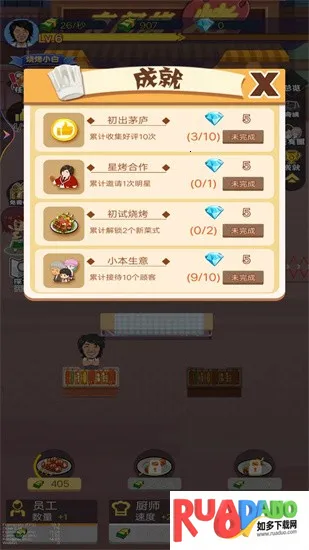 烤串小达人安卓版是一款烹饪经营游戏。玩家经营烧烤店,采购食材制作烤串,升级可开更多店铺。要掌握烹饪技巧、赢钱获配方,玩法多样,卡通画风,能感受经营乐趣,完成任务掌控全场。