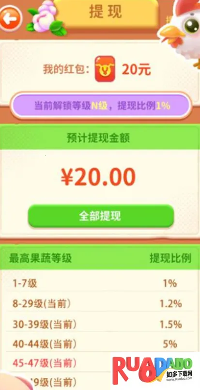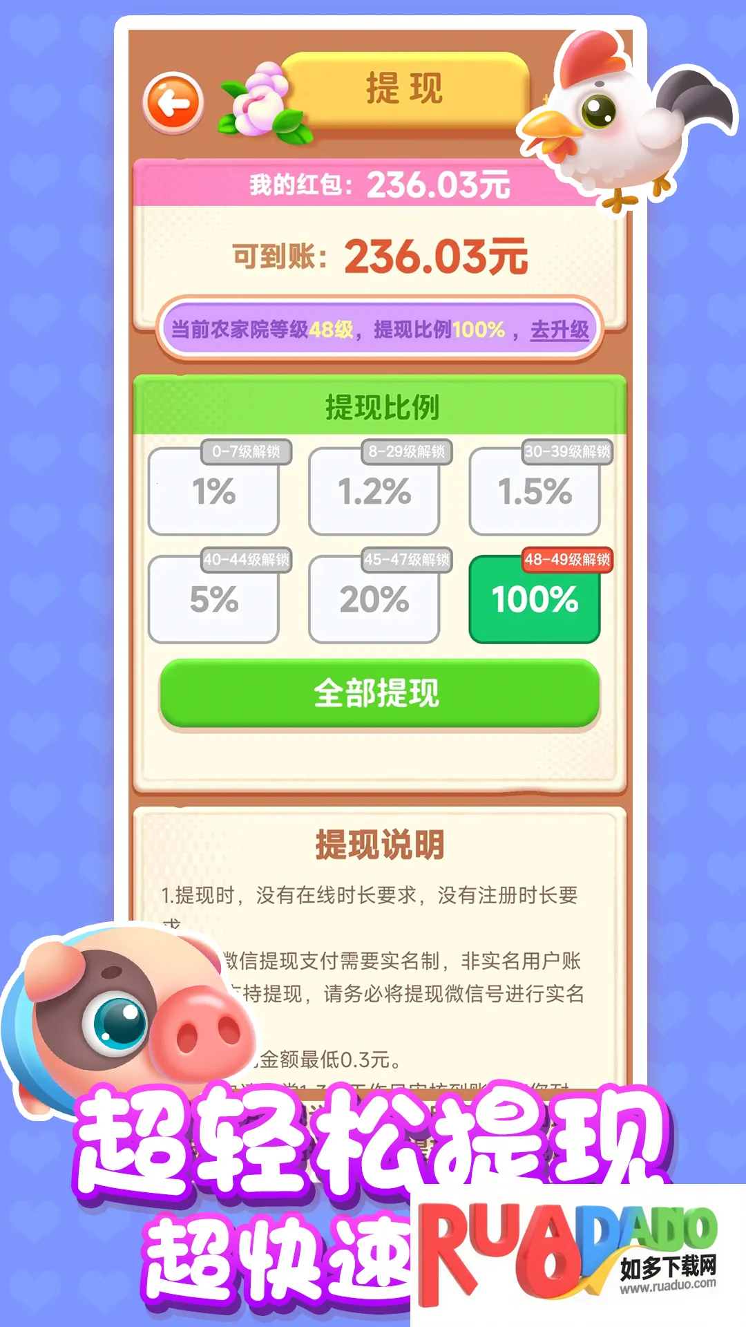 想体验农家生活还能赚钱吗?那就来试试《我的农家院》吧!在这款游戏里,你能成为农场主,管理自己的庄园。可以种植各种农作物,像小麦、水稻、玉米等,还能养殖鸡、鸭、牛、羊等可爱动物,感受丰收喜悦。游戏以经营模拟为主题,真实操作通俗易懂,老少皆宜。这里有丰富种植任务,完成能赚红包,还有多彩作物图鉴可自由解锁。通过辛勤浇水、修剪、除草,让植物带来红包乐趣。道具能助力植物成长,带来更多收益。赚取的资金可搭配解锁,在商店购买高级道具提升植物生长进度。新人完成第一个订单就能直接获得0.3元,签到转盘、完成任务也都能领红包。还能与好友互动,互相访问农场、交换农产品。快来本站下载,开启赚钱又好玩的农家经营之旅吧!
