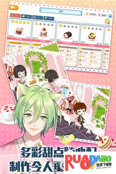 1. 游戏玩法丰富多样,玩家能在其中体验恋爱养成、卡牌收集、模拟经营等玩法,还可制作与研发4大类共40种甜品,自由安排店铺与休息室,通过完成各类任务解锁更多内容。