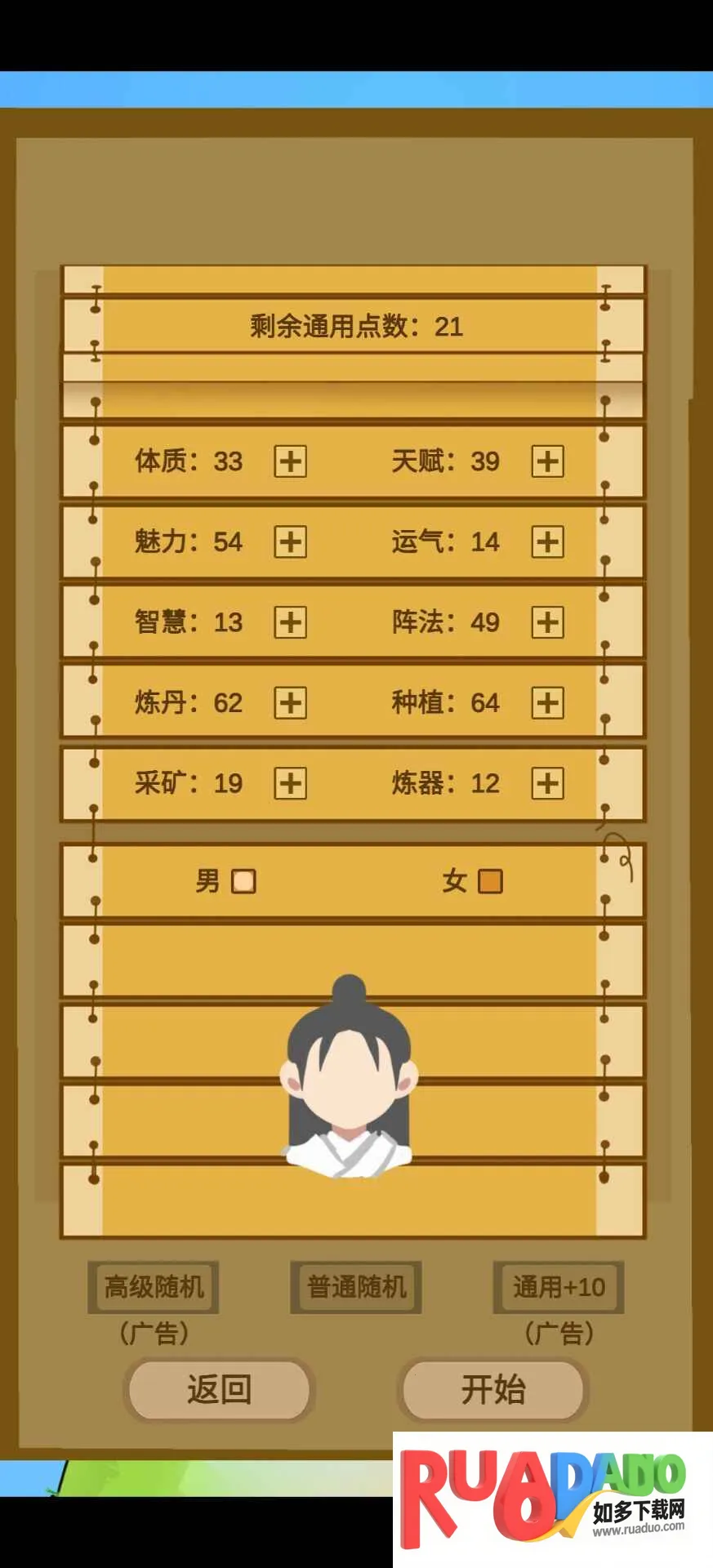 1. 开启充满冒险与探索的修仙旅程,玩家自行分配10种属性通用点数,不同分配影响角色体质与游戏结局。