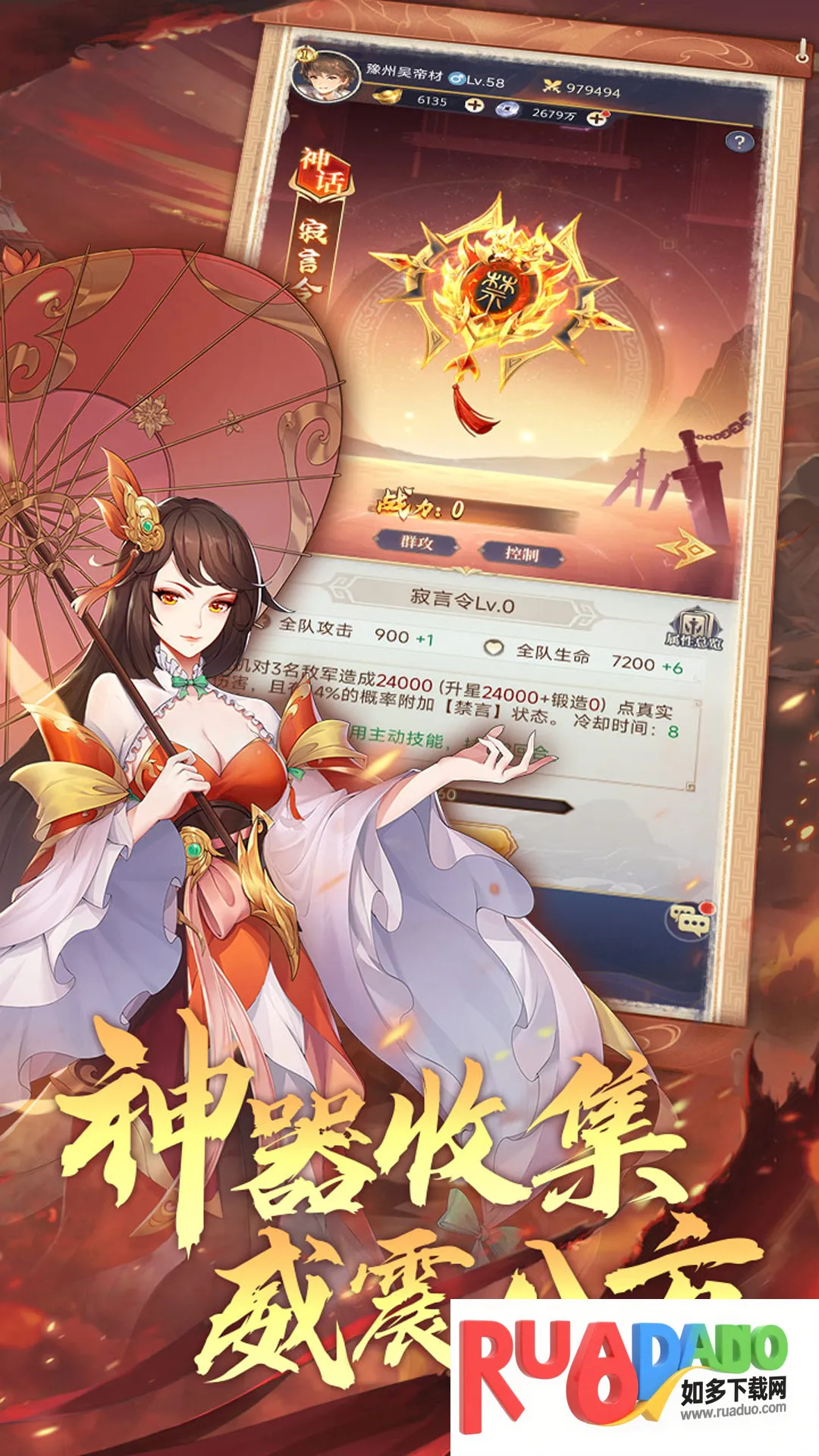 3. 策略组合,最强阵容灵活组建:武将阵营相互克制,多种职业相辅相成,技能组合与神器搭配,打造专属最强阵容。
