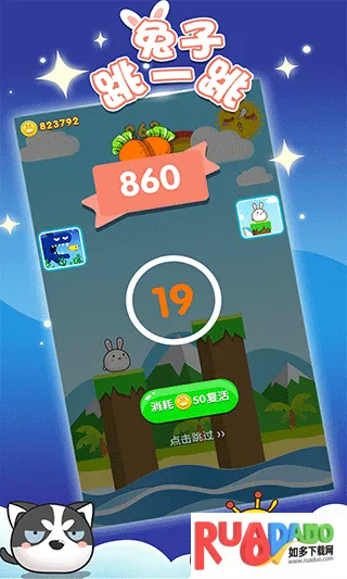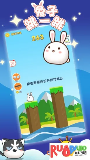 兔子跳一跳是一款卡通风格冒险闯关游戏。玩家操控小白兔跳跃,躲避胡萝卜等障碍物,收集金币。有超多关卡,画面精美,节奏轻快,操作简单易上手,还有独特角色配音,快来下载体验。