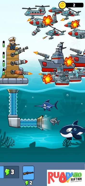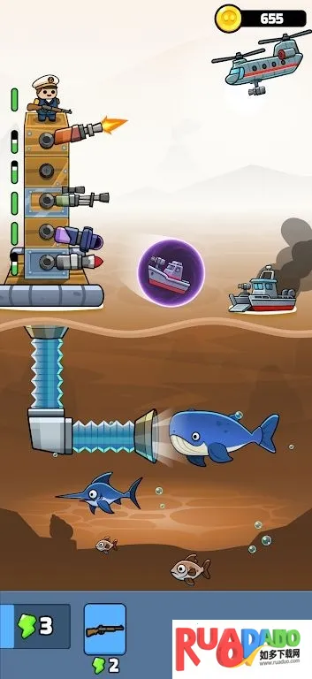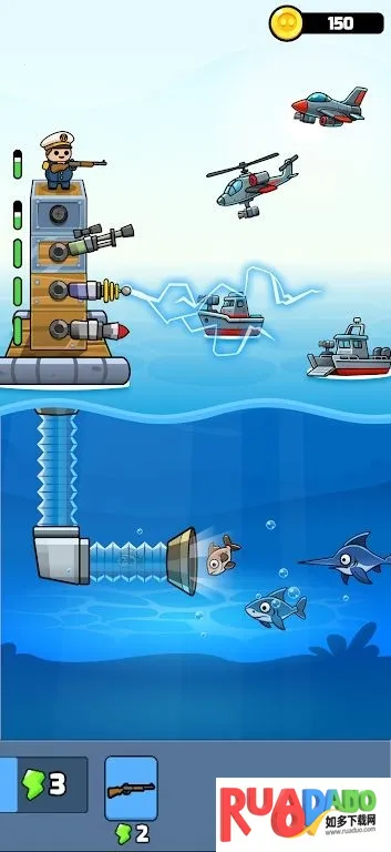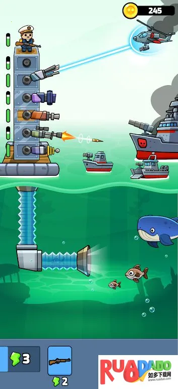 4. 全面升级发展:在海洋中前进,解锁新武器,强化防御塔,提升伤害、扩大射程,还有海量升级选项。