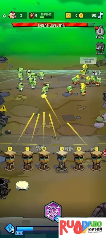 1. 它采用竖屏玩法,玩家在防线上放置瞭望塔攻击僵尸,还能合并升级瞭望塔提升战斗能力。