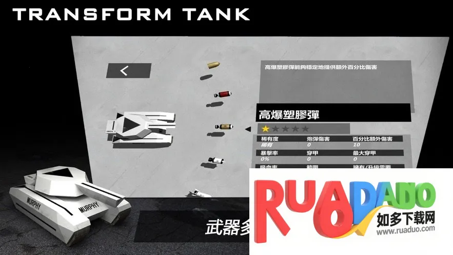 3. 坦克种类丰富,包含15种基础坦克,每种可通过升级解锁专属变形形态,如狂怒坦克变形后机甲手臂带电锯。