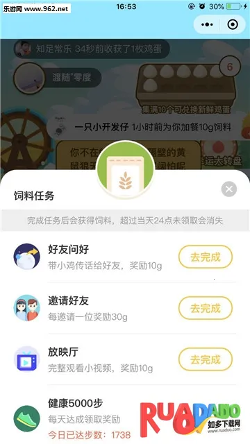 2. 完成每日任务获取饲料,喂养小鸡还能加速鸡蛋孵化。