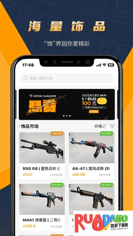 V5item安卓版是专为CSGO玩家打造的饰品交易平台,有海量饰品,交易安全省心。支持一键购买、在线检视、装备估价等。具备高效交易、安全模式、多元功能等特性,还有成交记录等亮点,更新不断优化体验。