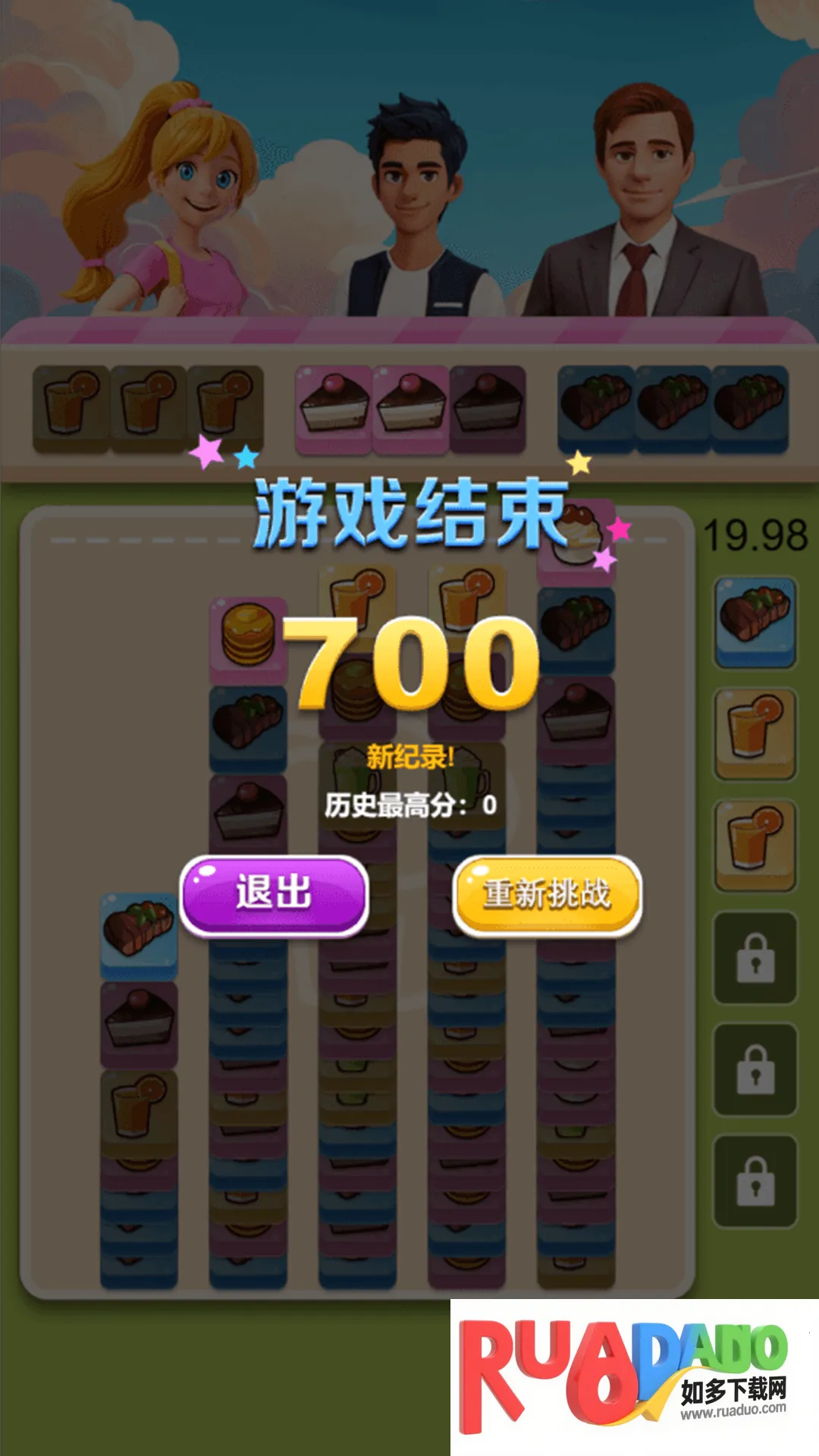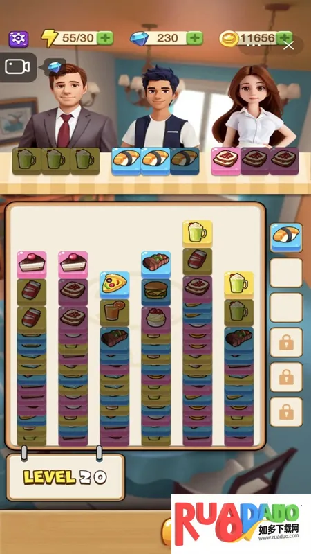 美食方块 2026 是竖版益智休闲小游戏,以美食卡牌为题材的三消游戏。有主界面三层餐厅建筑场景,玩家靠游玩获金币建设。游玩界面三个客人各需三张相同食材卡,点击卡柱选卡匹配,满足需求可消卡。