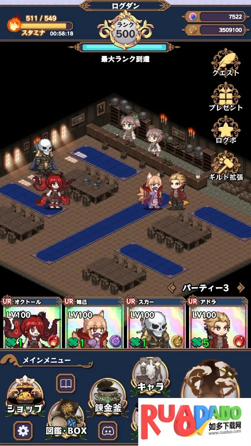 2. 玩家作为公会长支援冒险者,目标是成为第一公会。可通过清除地牢挑战更难的,地牢分多种难度。