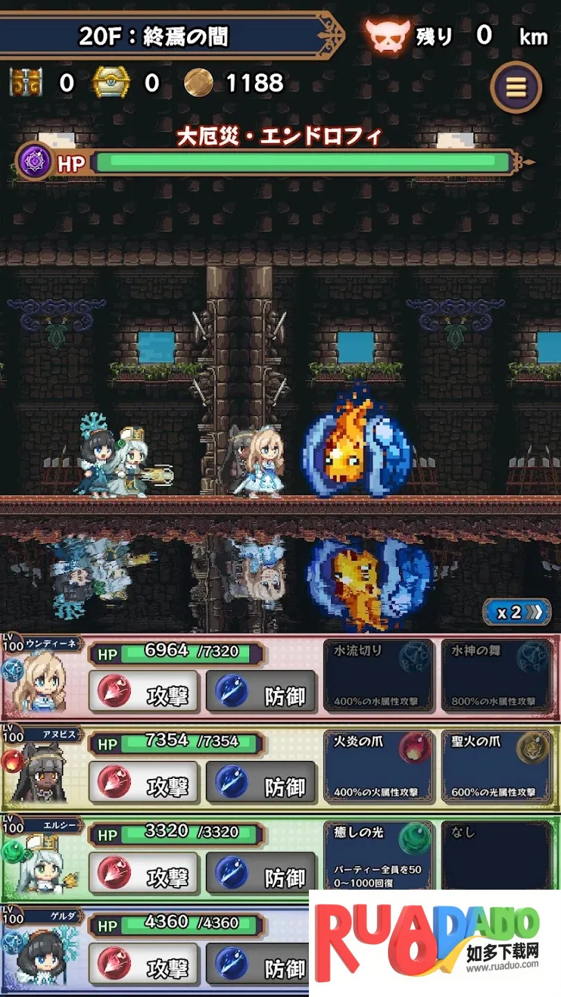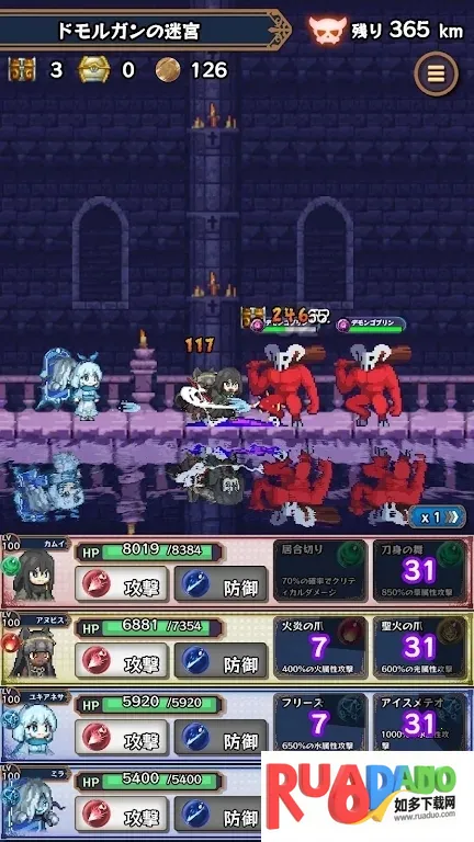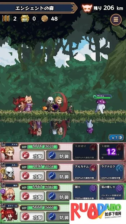 4. 角色和怪物有火、水、草、暗、光5种属性,需看属性相合组队,四人聚会可挑战地牢,攻击时基本自动移动、攻击,公会长能下达指令。