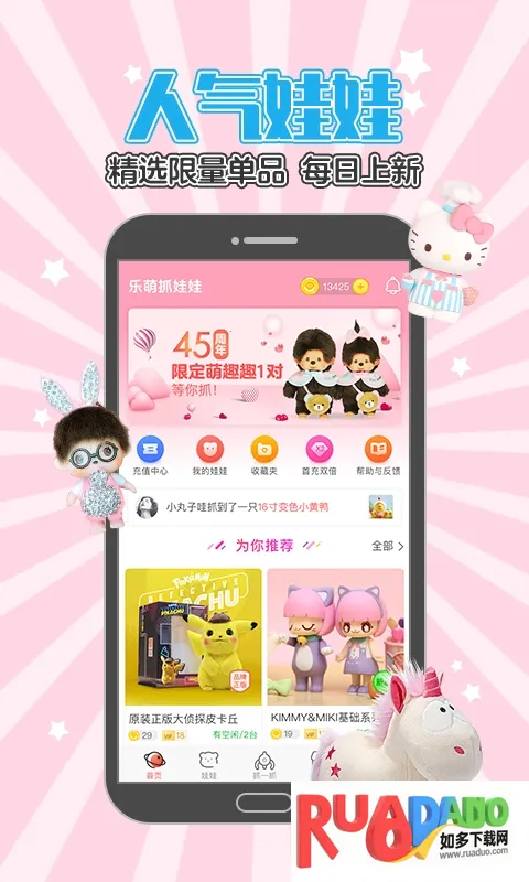 1. 乐萌抓娃娃汇集大量网红款玩偶,每日上新,如小猪佩奇、旅行青蛙、蒙奇奇等,每天都有新奇款式。
