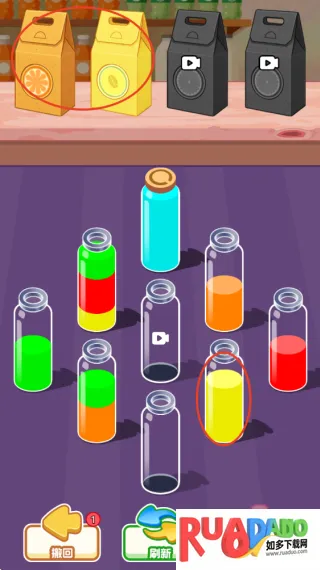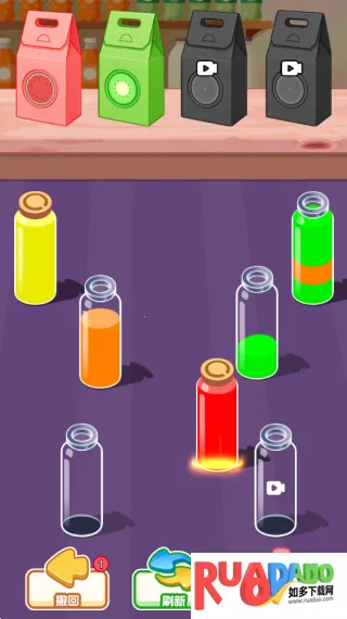 1. 面对复杂关卡时拆分目标,先完成部分颜色的分离,逐步简化场景布局,再聚焦剩余未分离的液体。