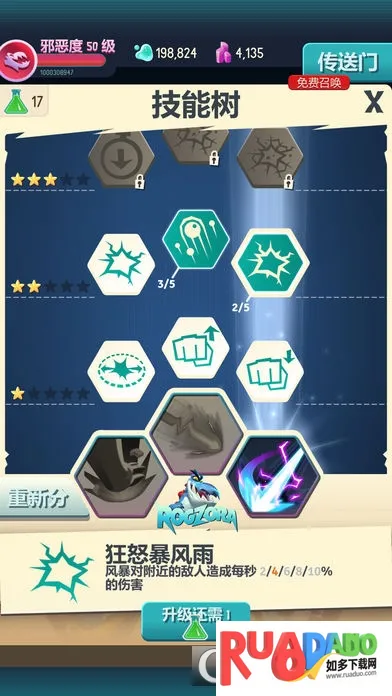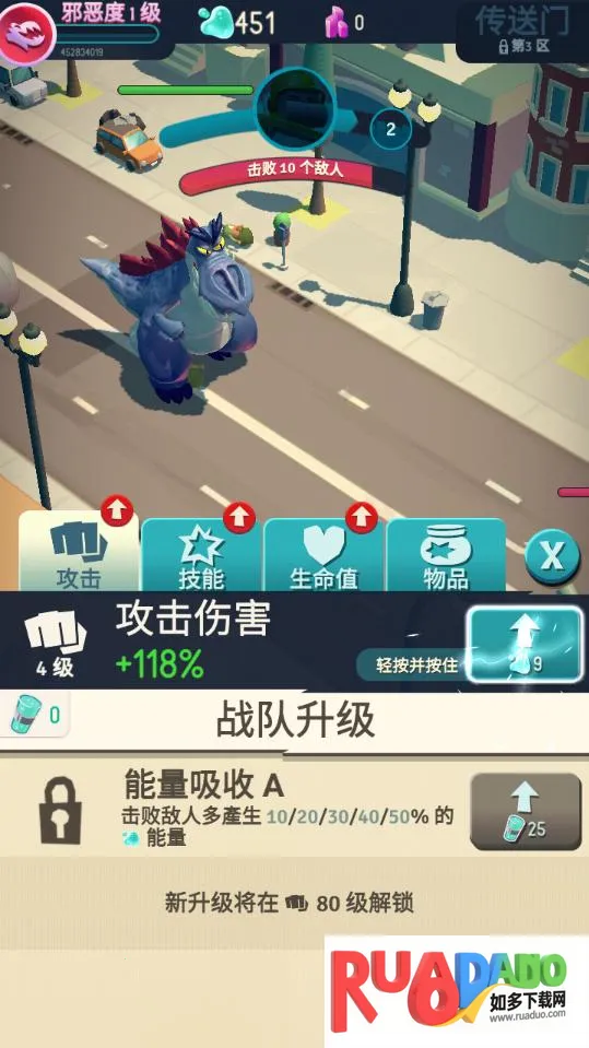 4. 可通过消灭敌人升级怪兽,提升属性,解锁新特性,还能招募帮手、完成任务、升级技能。