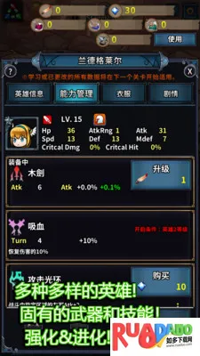 新手指南也贴心:下载安装后进入战斗界面,打败敌人进入下一关。上方看属性信息,强属性攻击弱属性有附加伤害。点击副本获金币宝石,有三种难度可选,难度越高奖励越丰厚。探险画面能得英雄进阶道具等。快来下载,享受英雄无限成长,体验精彩冒险吧!