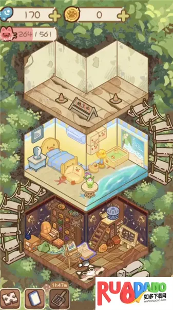 3. 日常经营内容丰富多样,要完成铲屎、清洁、采集食材和制作料理等任务,获金币解锁更多扩展层数。