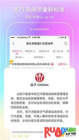 3. 定位查找:平台会依据用户手机的GPS定位,推荐最近的周边影院,方便观影。
