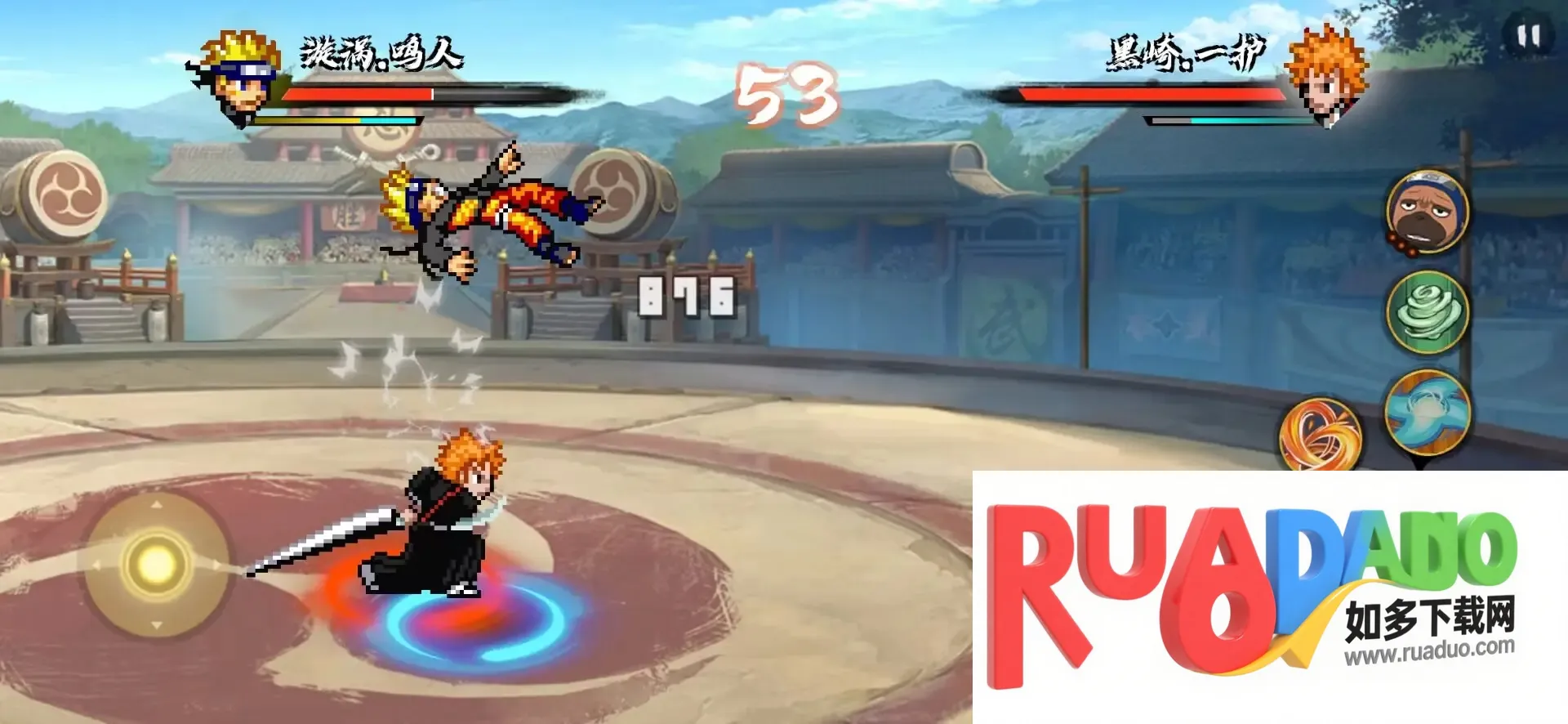 1、游戏将火影忍者等动漫中的经典场景与人物以像素风格重现,带来独特的视觉体验。