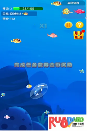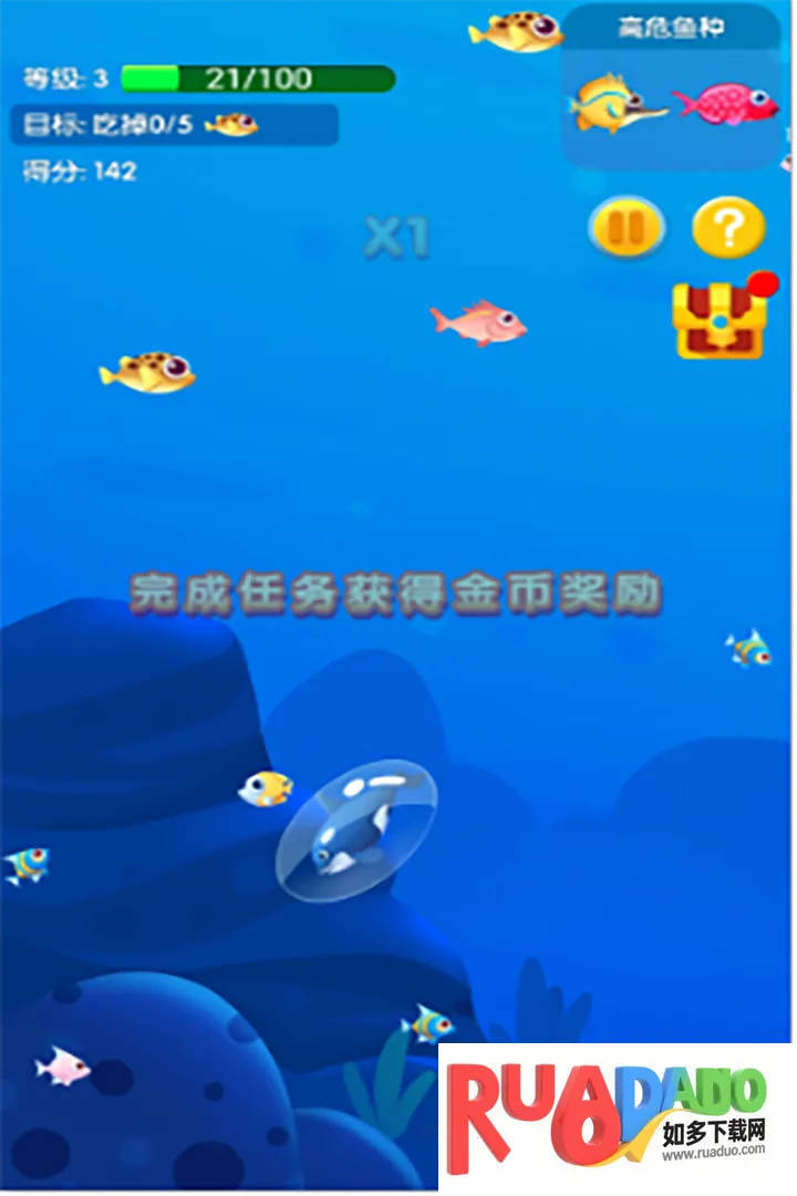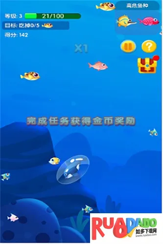 4. 丰富的玩法:可选择多种鱼类,通过控制移动、吞食小鱼变大、避开危险、升级挑战,最终成为最大的鱼。