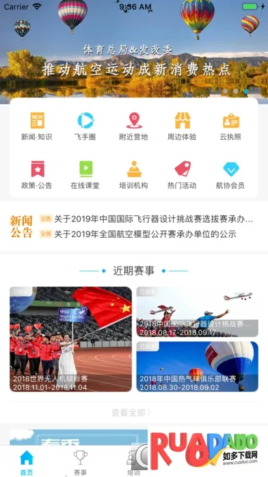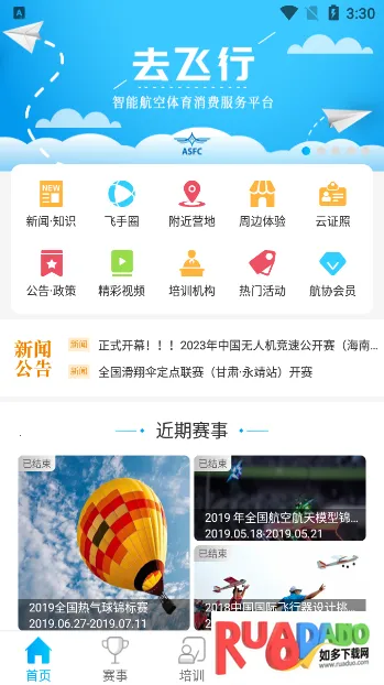 去飞行最新手机版是智能化航空体育文化消费综合服务平台,提供赛事管理、培训考试等丰富功能。支持查询营地、同步活动信息,可按需选培训课程,还有行业动态推送,方便用户关注赛事、学习知识,推动航空体育产业发展。