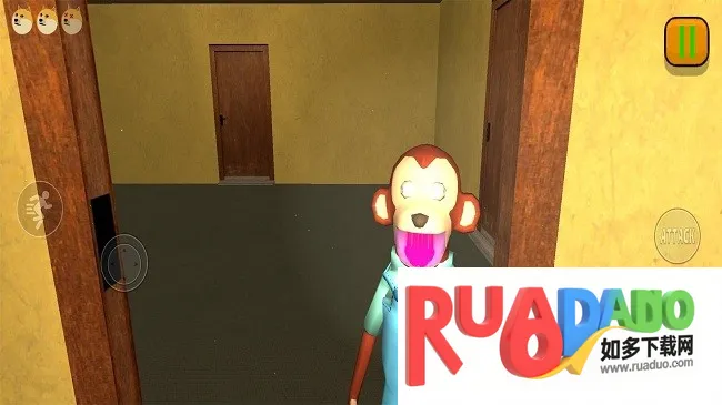 游戏操作简单,左侧虚拟按键控制移动和奔跑,右侧有手电筒和攻击按键。每个关卡目标是找两个神秘汉堡解锁下一关。探索中,推开一扇门可能有各种随机事件,比如撞上死墙、遇到柴犬或猴子。柴犬很危险,要赶紧关门撤退;猴子无恶意但会尾随,可暂时关在门外。成功找到汉堡通关能获数值奖励提升角色等级。
