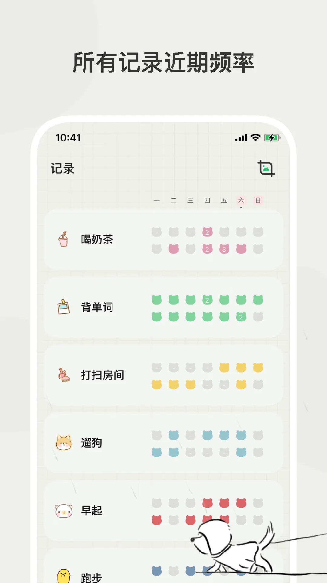 2、操作简单易上手,能轻松添加各类打卡任务,支持多次打卡,小熊耳朵显示次数,长按可进行更多操作。