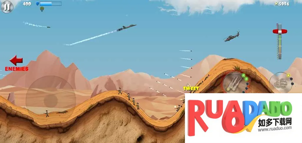 3、多种类型敌人,士兵、坦克、直升机、飞机等,多种地形可供战斗。