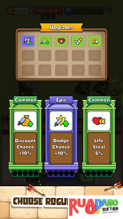 3、随着等级提升,选择Roguelite技能卡牌,创造协同效应。
