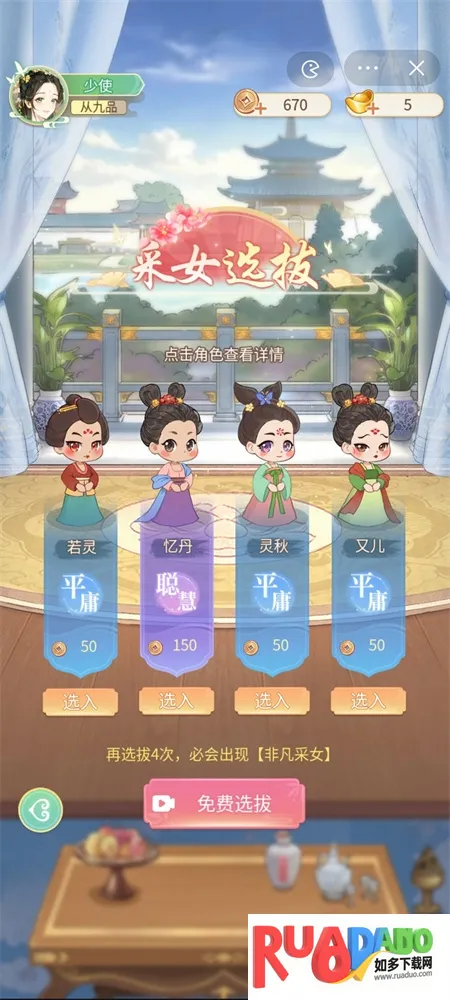 2、玩家可以点击采女查看信息来选择好采女。
