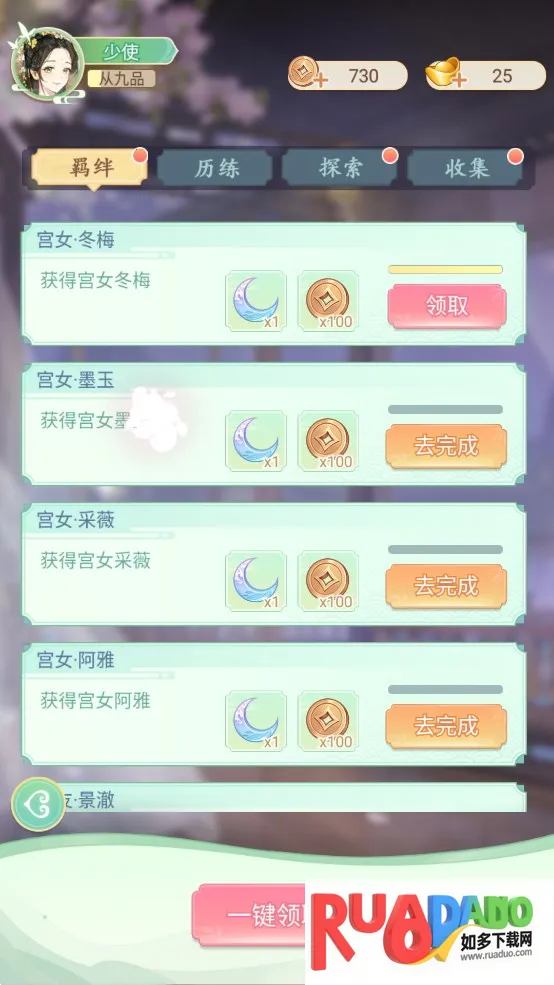 玩家通过选拔、升级宫女、解锁故事羁绊等可以解锁羁绊成就,领取丰富成就奖励。