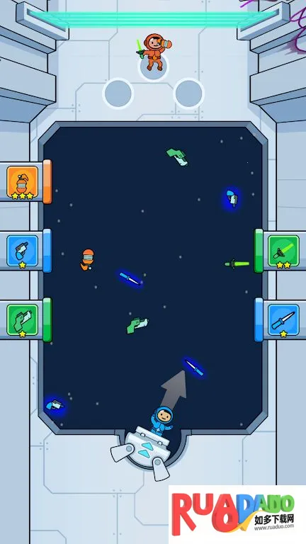 3、将宇航员射向太空,在零重力环境下拾取武器,控制飞行轨迹避开障碍物收集奖励。