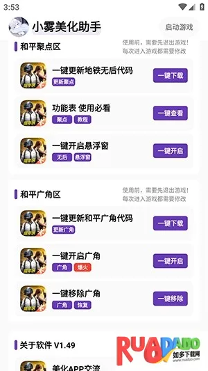 小雾美化包免卡密版是一款专为吃鸡玩家打造的美化助手。能修改道具和角色皮肤,调整画质,有多种修改选项,安全稳定且免费。界面简洁,资源管理高效,定期更新,还有使用指南和反馈机制助玩家畅享美化体验。