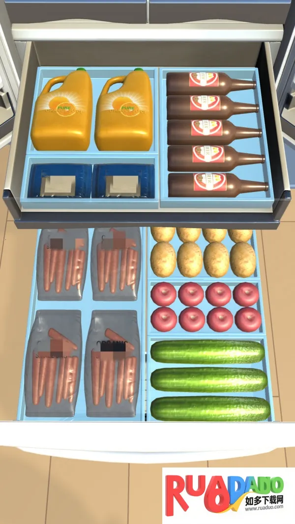 3 成功将杂乱物品整齐归置后,冰箱内整洁有序的画面会带来成就感。通关后还能获得时间沙漏道具,可在普通关卡中暂停时间或延长挑战时间。