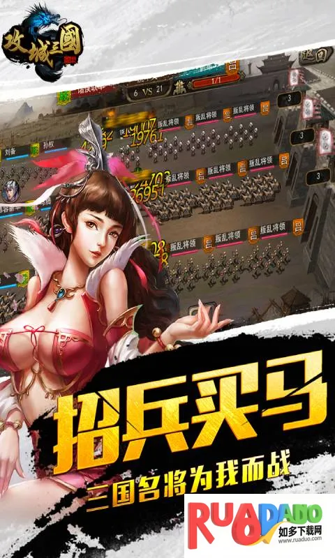 3、华丽伙伴:超过50个三国武将可供招募,猛将、军师、统帅任您选择。