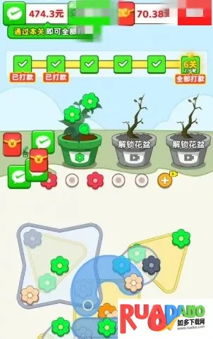 3. 可通过观看视频解锁花盆,遇到花盆不够的情况,观看视频就能解锁新花盆,提升获胜几率。能感受种花与消除的双重乐趣,适合碎片时间玩,每次完成任务积累红包奖励还能随时提现。