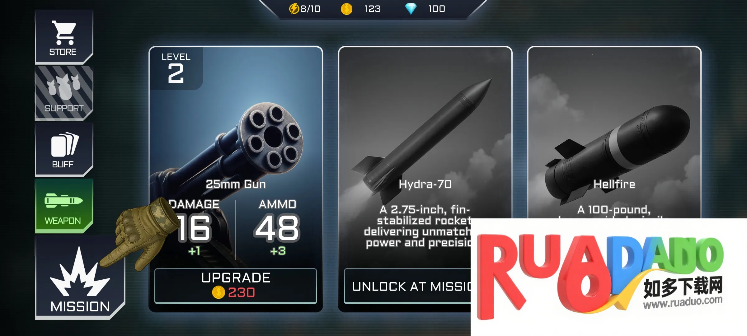 3. 武器库强大,可为无人机配备速射机枪、火箭弹和制导导弹,还能解锁升级定制装备。