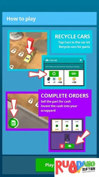 将汽车运送到车房,然后起重机将其移至汽车断路器,在那里拆卸工场的工人将汽车上的零件卸下;然后将它们移至破碎机,并将备件移至仓库,玩家随后解锁了诸如轮式工作站之类的制作站。他们可以购买制作不同物品的蓝图,所有人都成为一个无用的废品大亨,成为百万富翁的资本家!