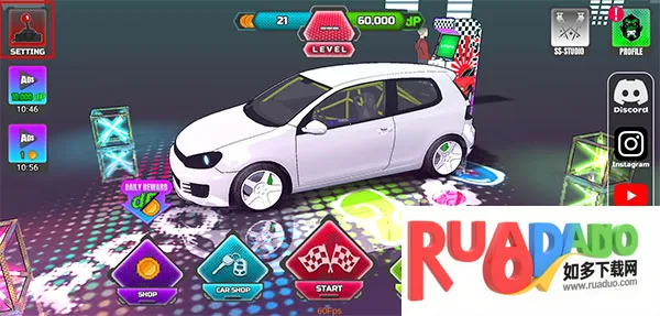 1、打开项目漂移2.0游戏,点击左上角“setting”;