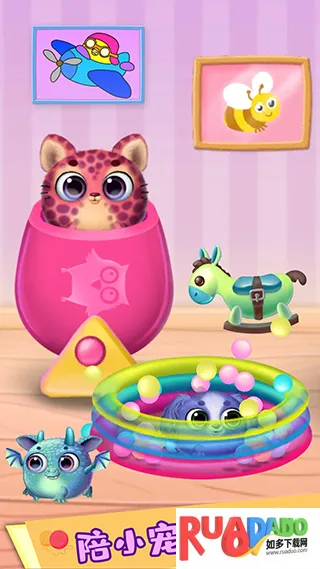 1. 能模拟养宠物过程,孩子可在游戏中得到可爱小狗与小猫并互动。