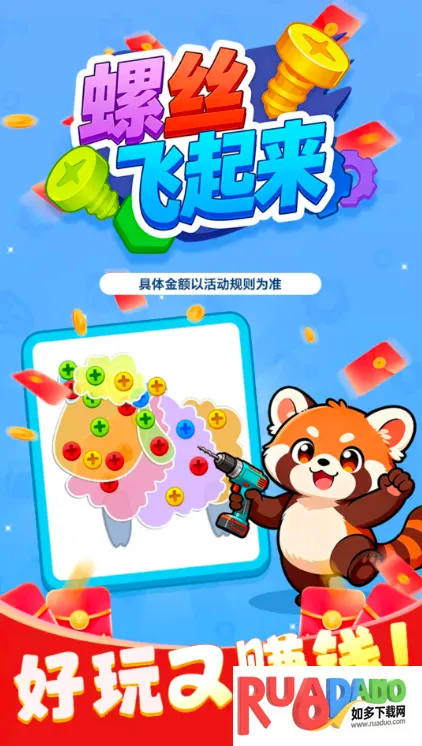 想轻松赚钱又能享受游戏乐趣吗?那就来试试“螺丝飞起来赚钱”这种玩法吧!在这个游戏里,消除螺丝就能获取零花钱,赚取丰厚红包。游戏中有各种颜色的螺丝,玩家把相同颜色的螺丝合成消除,清空面板就能获胜,全年龄阶段都能玩。它的特色很棒,能进行欢乐的颜色匹配和快速消除任务,仔细分辨螺丝颜色,遇到困难还能免费使用道具。亮点也不少,每一关循序渐进,不断带来新任务布局和新鲜感;按颜色搭配螺丝完成消除条件可解锁后续关卡;还能锻炼眼力和手速,利用物品道具赢奖励。玩法简单,单手点击合成相同颜色螺丝,随时可点击挑战高难度通关任务,每完成一关就能获得奖励,边玩边赚零花钱,解压又放松,新老玩家都能放心畅玩。