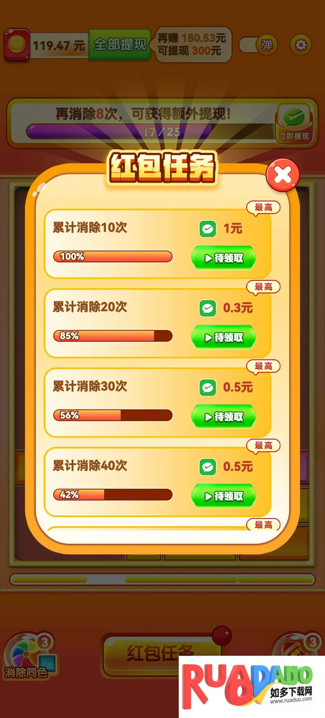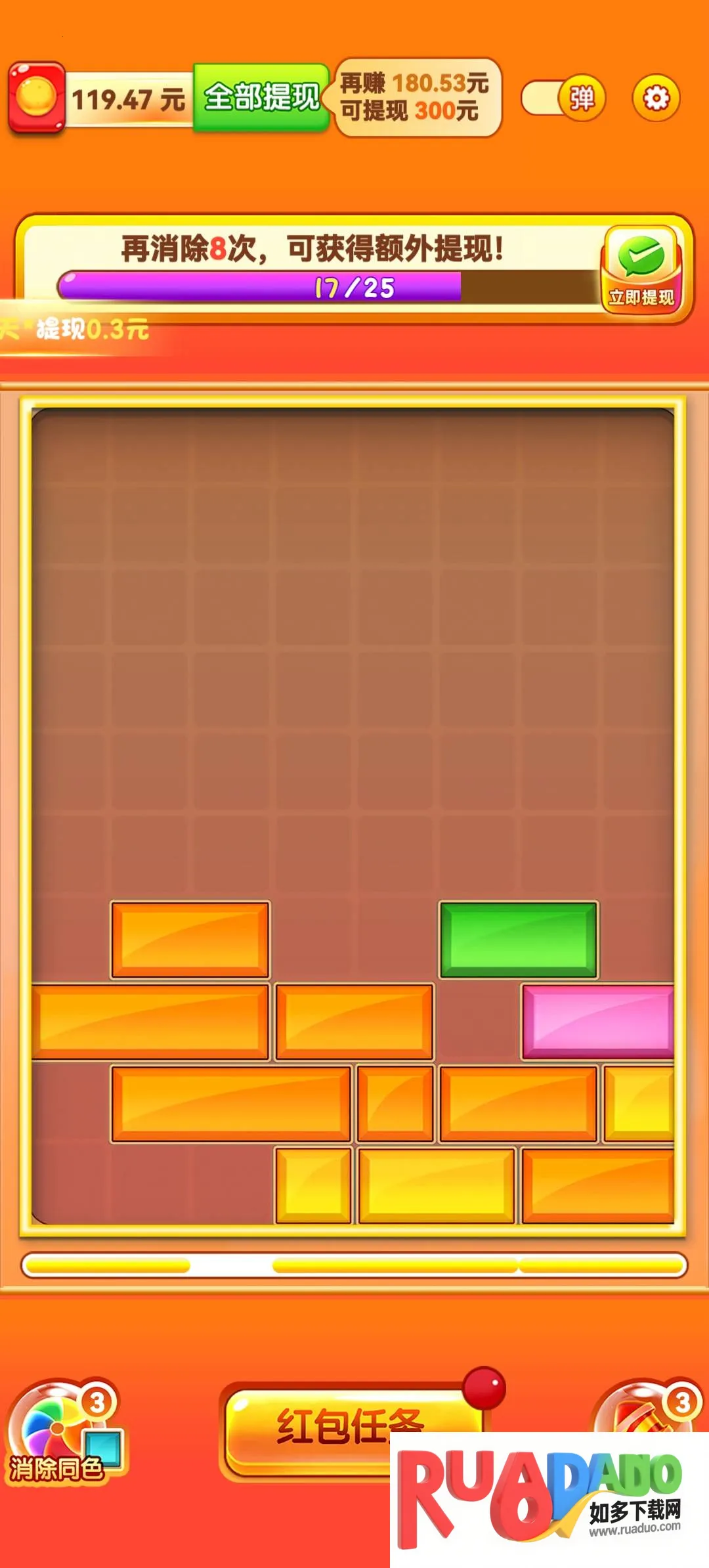 4. 娱乐性强,每次进入都能享受愉快氛围,还有动感音乐调动积极性。红包奖励实在能直接提取,玩法多样,有多种模式和丰富关卡,完成任务可获丰厚奖励,还有神秘道具助通关,场景美轮美奂,有多人联机玩法和隐藏彩蛋,乐趣无穷。