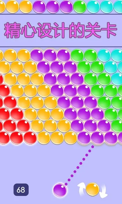 3. 操作简单,轻点屏幕指定射击位置,形成3个或以上同色泡泡即可消除。