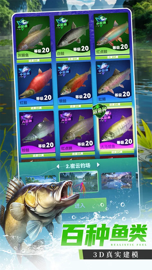 1、真实模拟:通过3D技术和物理引擎,深度还原环球钓点与百种鱼类,带来身临其境的钓鱼体验。