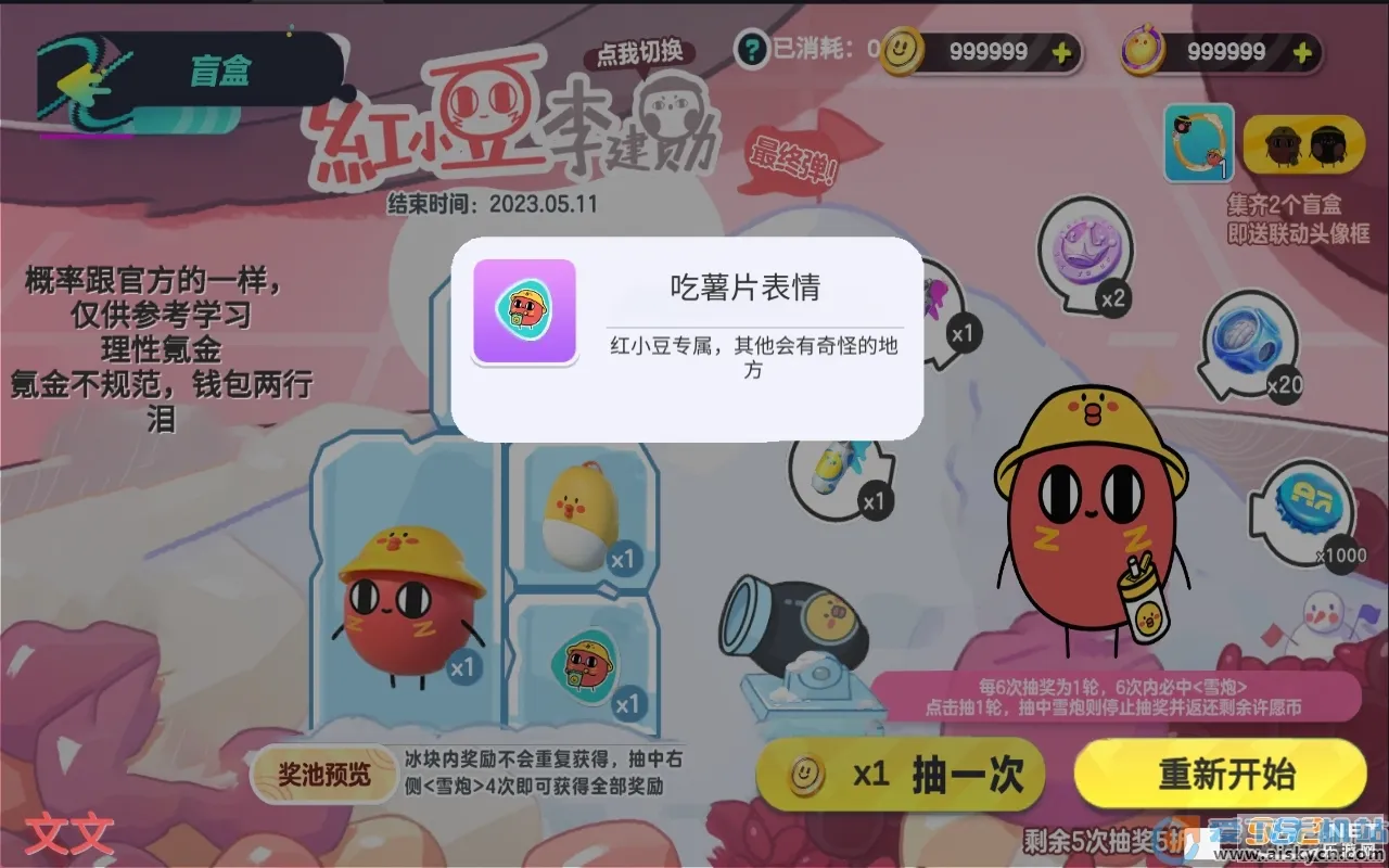 4. 奖池内容能实时预览,设有六次抽奖保底机制,雪炮累积可兑换物品,集齐盲盒礼包有联动头像框。