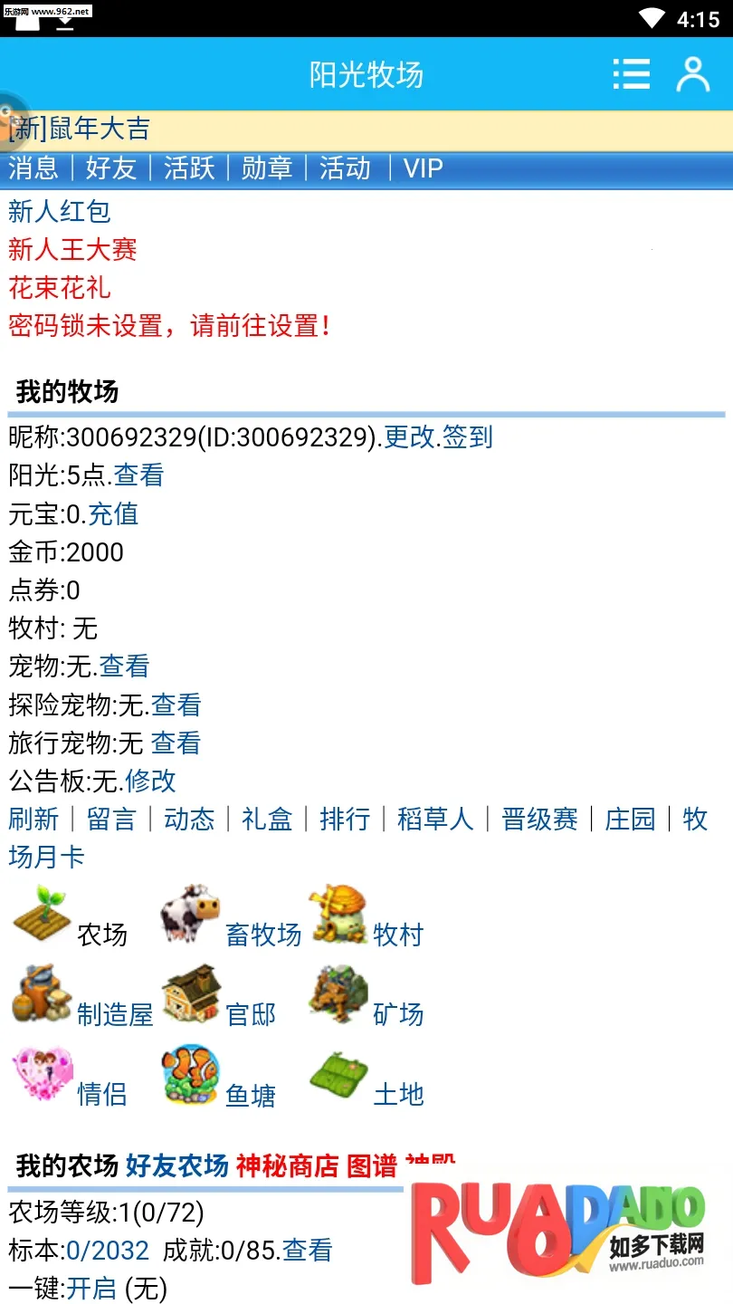 阳光牧场是一款牧场题材经营手游,玩家扮演牧场主,管理日常、种植作物、养殖动物,能与好友互动偷菜。游戏以文字图片为主,玩法丰富,界面清新,操作简单,带你重温悠闲的牧场时光 。