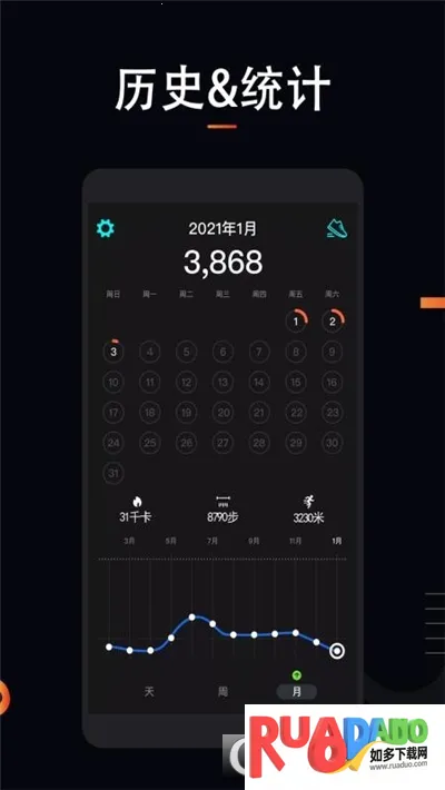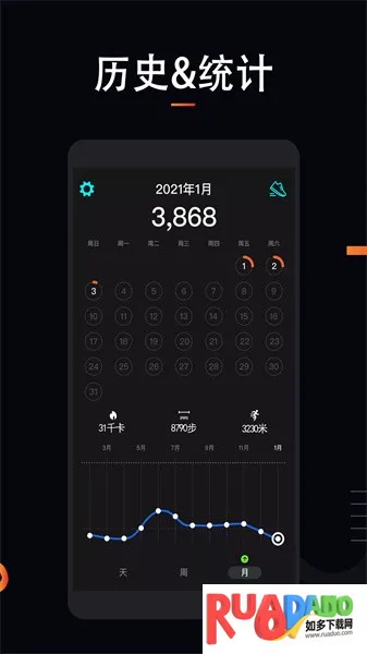 4、详细记录活动情况,绘制日周月统计表,对热量消耗、步数等进行统计。
